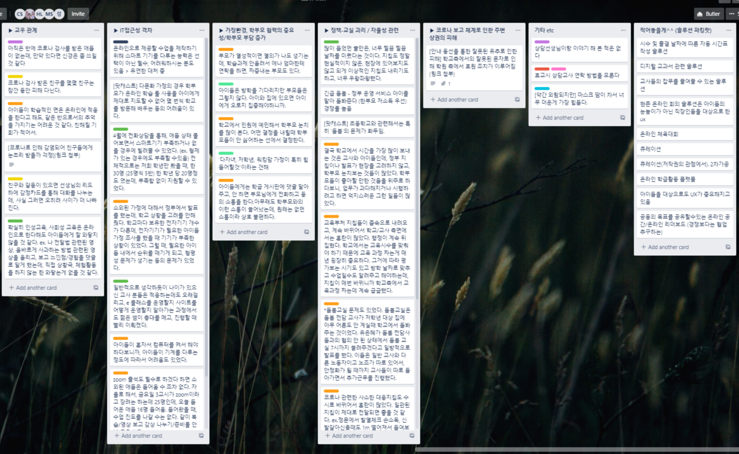 ๊ทธ๋ฆฌ๊ณ ์ค๋, ํฉ์ด์ ธ์ ์ธํฐ๋ทฐ๋ฅผ ๊ฐ์ ์ํํ๋ ์ฐ๋ฆฌ๋ ๋ชจ์ฌ์ ์ธํฐ๋ทฐ ์ง๋ฌธ์ง๋ค์ ์ทจํฉํ๋ค. ์ทจํฉํ๋ ๊ณผ์ ์์ affinity diagram์ ํ์ฉํ๊ณ ์ ํ๋ค. ์๋๋ ํฌ์คํธ์์ ๋ถ์ฌ๊ฐ๋ฉด์ ํด์ผํ๋๋ฐ, ์ฐ๋ฆฌ๋ง์ ํ์์ค์ด ๋ง๋ จ๋์ง ๋ชปํ ์ํฉ์ ๊ณ ๋ คํ์ฌ ์จ๋ผ์ธ ํด Trello๋ฅผ ํ์ฉํ๊ฒ ๋์๋ค. ์ฐ๋ฆฌ๋ ๋จผ์ ์ฐ๋ฆฌ๊ฐ ์ํํ ์ธํฐ๋ทฐ์ด ๋ฆฌ์คํธ๋ฅผ ์ผ์ชฝ์ ๋์ดํ๋ค. A๋ถํฐ J๊น์ง ํ๋ถ๋ชจ, ์์ด๋ค, ๊ต์ฌ๋ฅผ ํฌํจํ 10๋ช ์ ์ธํฐ๋ทฐ์ด์ ์ด์ผ๊ธฐ๋ฅผ ์์งํ๋ค.